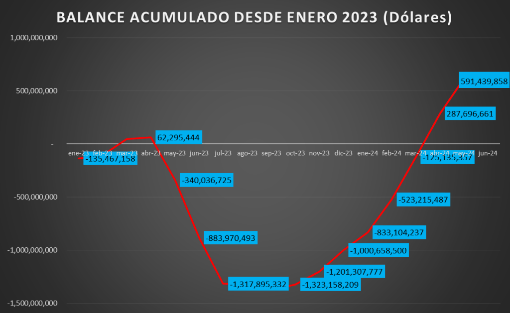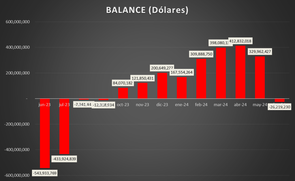 Las importaciones totales en junio de 2024 fueron de 373,6 MMu$s (las del mes anterior habían sido 161,6 MMu$s) y las exportaciones de 347,4 MMu$s, resultando un balance negativo de 26,2 MMu$s.
