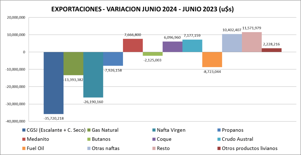 En junio de 2024 no se exportó crudo desde la Cuenca del Golfo San Jorge (Escalante y Cañadón Seco). Recordar que la exportación por barco puede generar el traslado de la imputación de un embarque de un mes a otro.