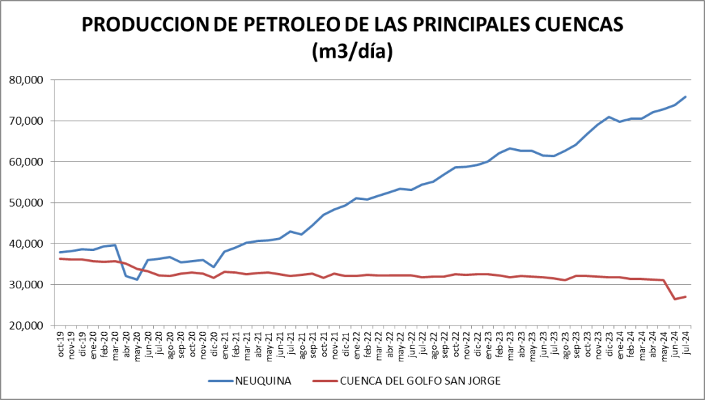La Cuenca Neuquina es la que más sigue creciendo interanualmente, apoyando su producción en Vaca Muerta (+23,39%, interanual). La segunda cuenca en importancia, la del Golfo San Jorge bajó, nuevamente, un extraño 14,37% debido a las difíciles condiciones climáticas que imperaron en la cuenca en junio.