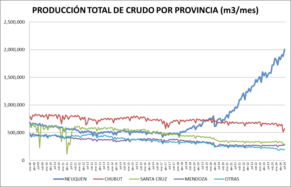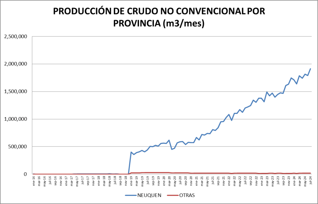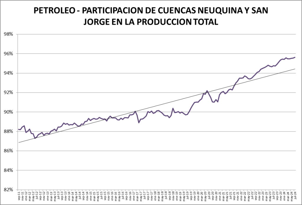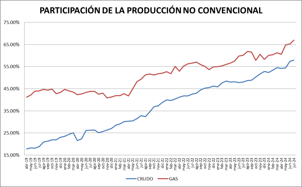 La participación del crudo no convencional en el total de la producción nacional fue, en julio de 2024, del 57,98% y se constituye en un nuevo record.