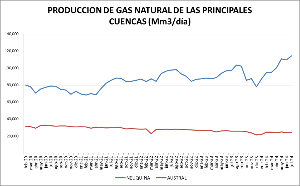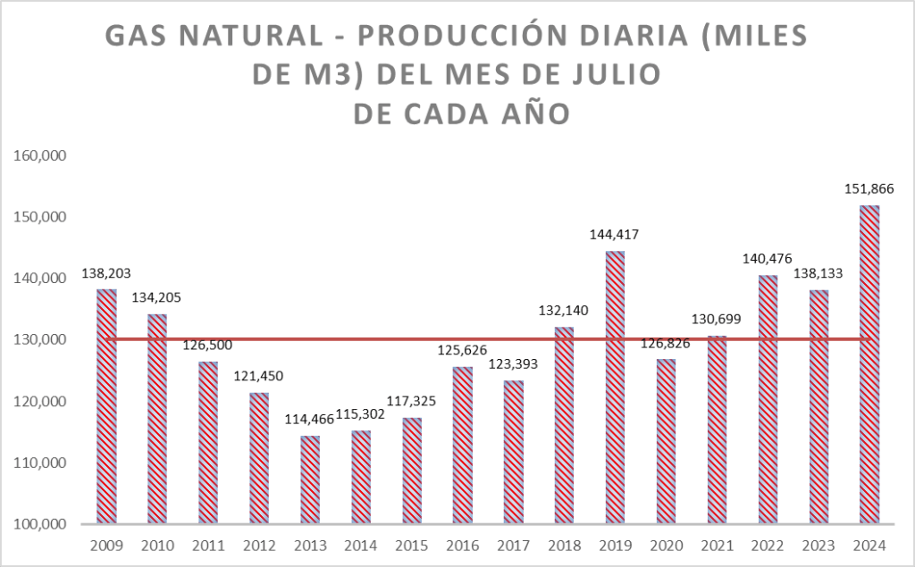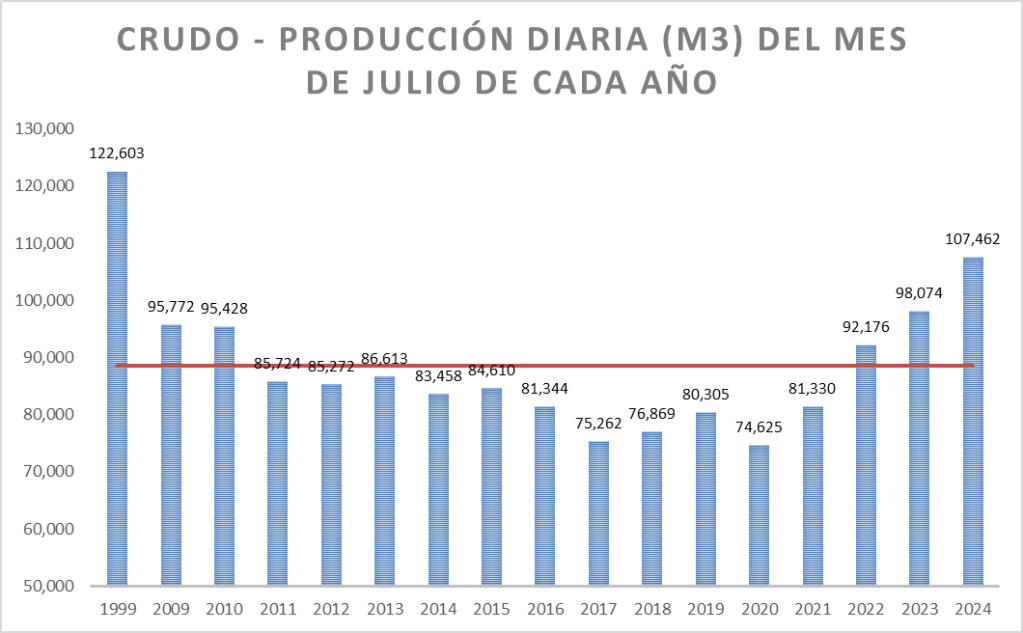 La producción diaria de julio de 2024 es superior al promedio de la serie (que incluye el valor de 1999 y es 88.642 m3/día).