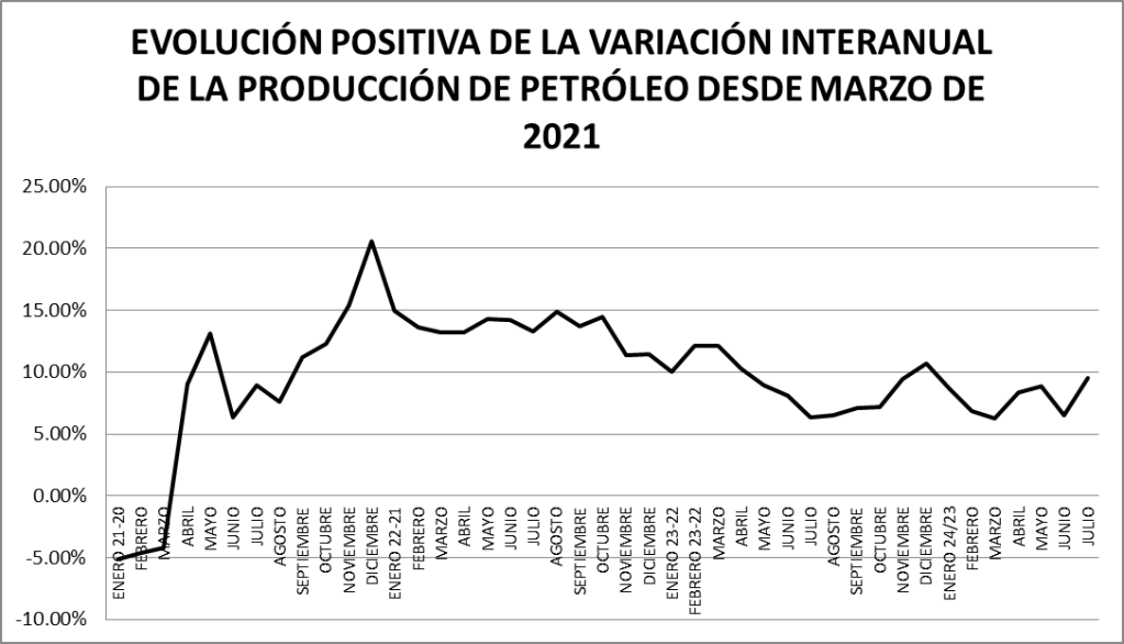En el mes de julio de 2024, en petróleo crudo, se muestra un crecimiento interanual en sintonía con la evolución normal.