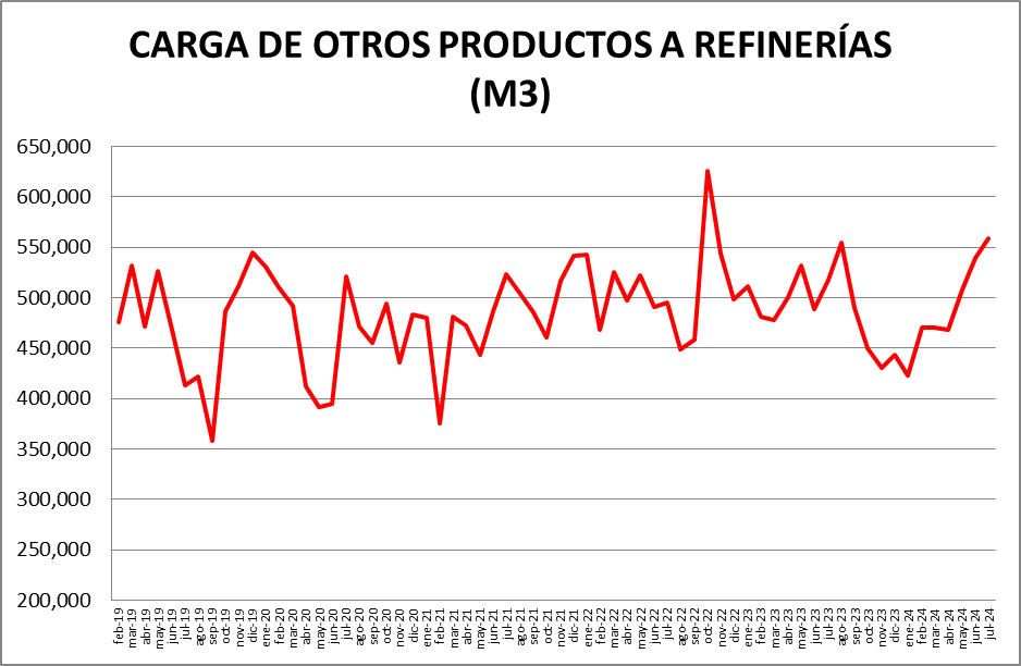 Dentro del rubro “Otras cargas” donde ” se encuentran: naftas sin terminar, mejoradores octánicos, cortes de gasoil, nafta virgen, cortes de kerosene, nafta reformada, destilado de vacío, etc., la evolución fue la siguiente: respecto a junio de 2024: +3,61%; respecto a julio de 2023: +8,10%.