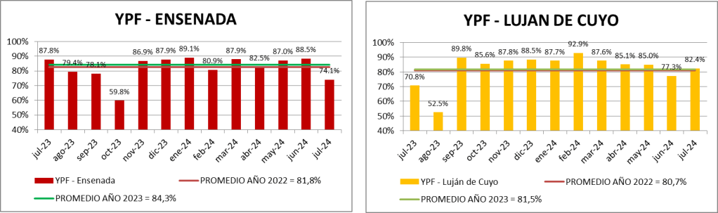 El crudo proveniente de la Cuenca del Golfo San Jorge (Escalante y Cañadón Seco) fue el que más sintió el descenso (-35,6% respecto a julio de 2023). Hay que considerar la baja de producción de la cuenca producida por causas meteorológicas en junio y julio de este año (ver informe de producción publicado por todohidrocarburos.com el 28 de agosto de 2024): https://wordpress.com/post/todohidrocarburos.com/15504