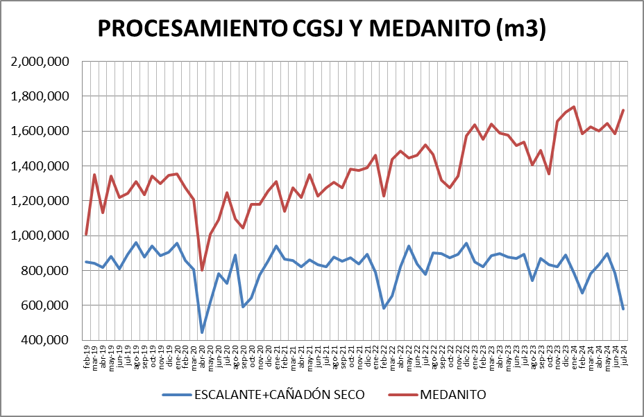 Escalante-Cañadón Seco: Se procesó, en julio de 2024, un 35,04% menos que en junio de 2024 y un 35,06% también por debajo de julio de 2023.