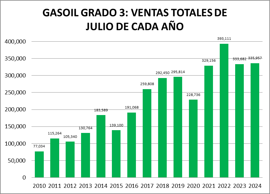 Agregamos también las ventas de nafta de alto octanaje (grado 3) donde notamos que los valores de julio de 2024 son inferiores a los registrados en varios de los años del período analizado.