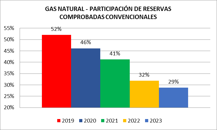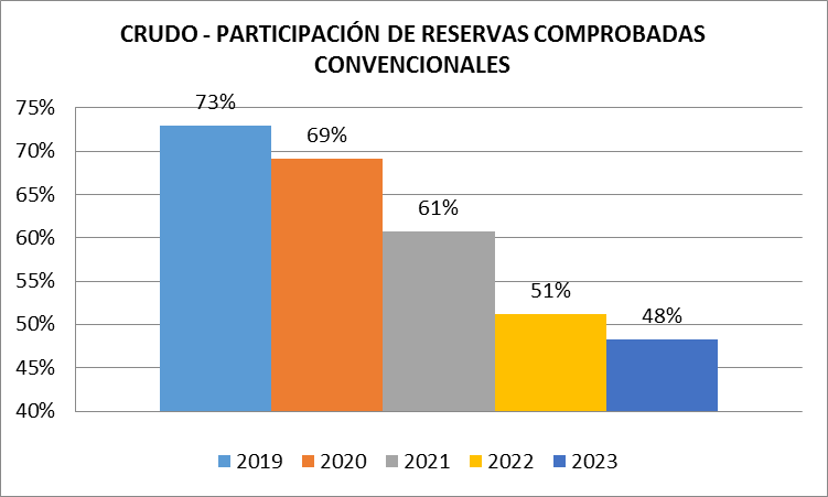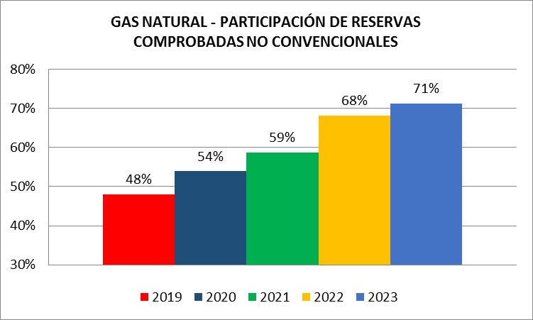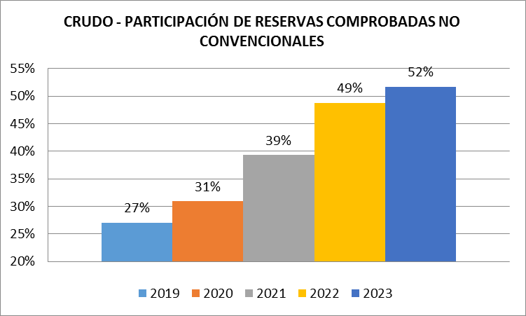 La participación de las reservas no convencionales pasó del 27,0% en el 2019, al 30,9% en 2019, al 39,3% al 31 de diciembre de 2021, al 48,8% al 31 de diciembre de 2022 y al 51,7% al 31 de diciembre de 2023