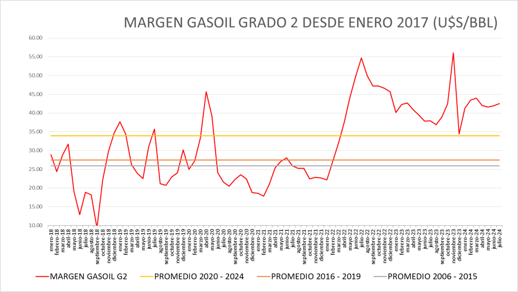 El Margen del gasoil grado 2 de junio de 2024 (42,52 u$s/bbl) se sitúa por encima del promedio del período enero de 2016 a julio de 2024 (32,24 u$s/bbl).