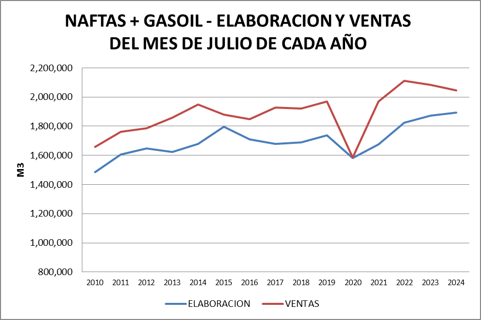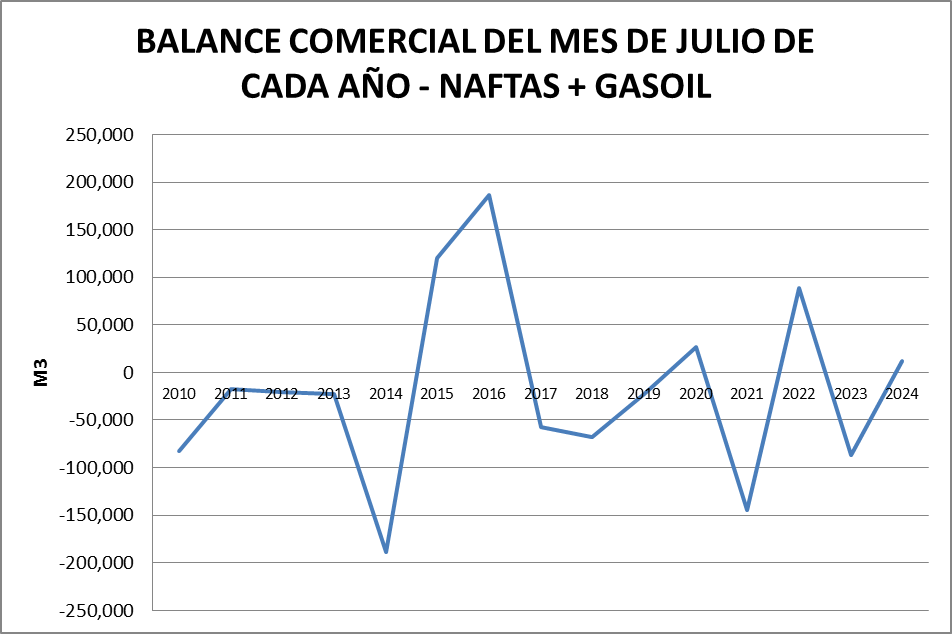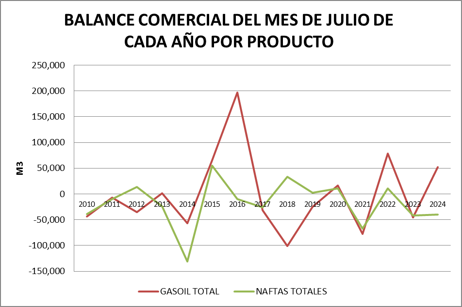 En julio de 2024 sigue el negativo de gasoil grado 2 aunque se verificó una compensación con el balance de gasoil grado 3. No se registran faltantes de productos en el mercado.