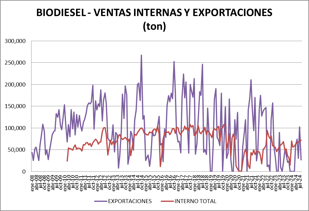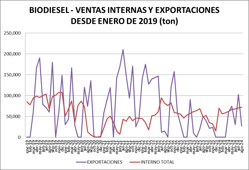 Para el biodiesel, la información parte desde enero de 2008 para las exportaciones y desde febrero de 2010 para la venta a refinerías.