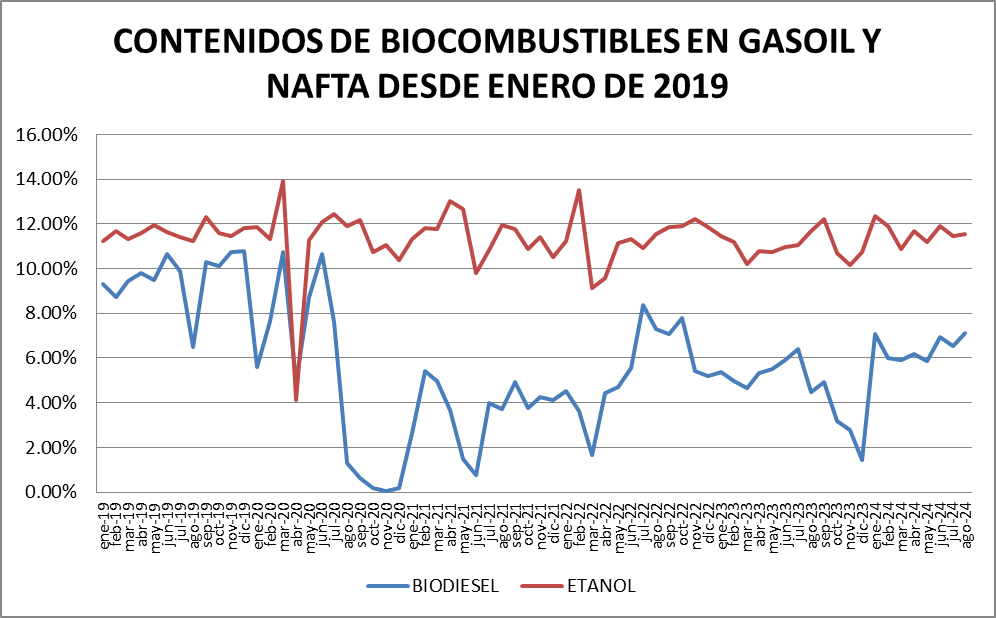El contenido de bioetanol en naftas fue del 11,56% en agosto de 2024 en el entorno normal de funcionamiento del sistema.