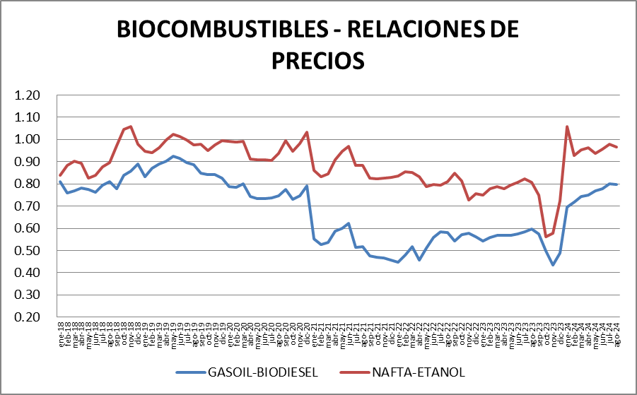 La relación de valores en nafta – etanol (0,97) bajó levemente respecto al mes anterior.