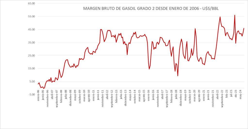 El Margen del gasoil grado 2 de septiembre de 2024 (45,94 u$s/bbl) se sitúa por encima del promedio del período enero de 2016 a julio de 2024 (32,47 u$s/bbl).