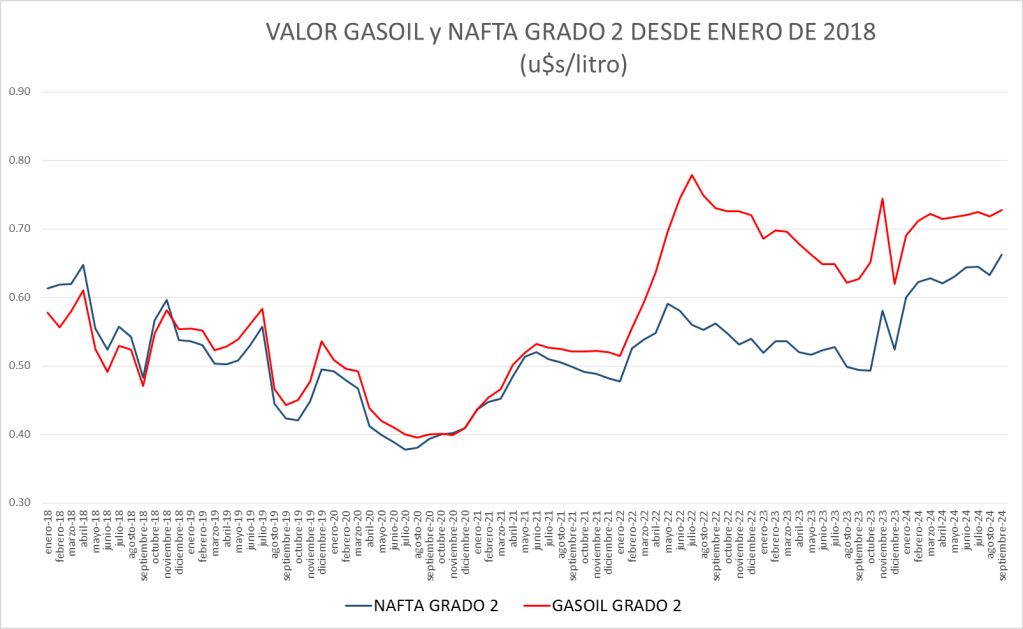| En u$s/litro | NAFTA GRADO 2 | GASOIL GRADO 2 |