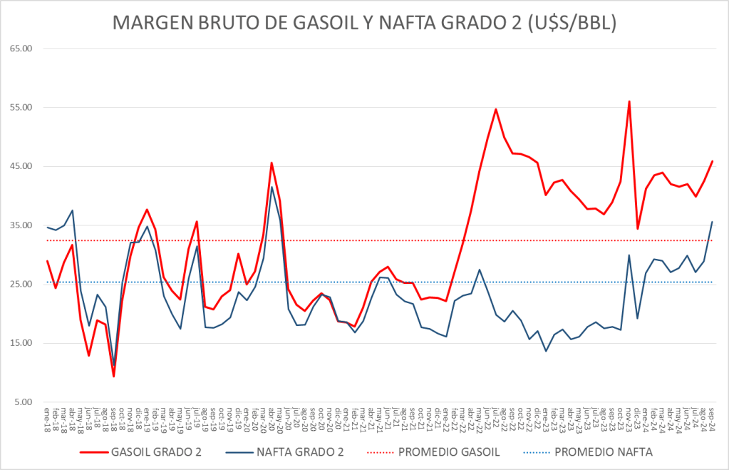 El margen bruto de nafta supera, en septiembre de 2024, a todos los promedios adoptados como referencia.