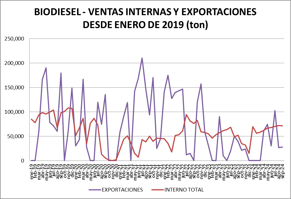 Para el biodiesel, la información parte desde enero de 2008 para las exportaciones y desde febrero de 2010 para la venta a refinerías.