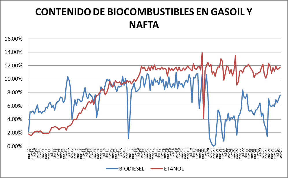 | CONTENIDO DE BIOCOMBUSTIBLES EN GASOIL Y NAFTAS | sep-24 | VARIACIÓN RESPECTO AL MES ANTERIOR | VARIACIÓN RESPECTO AL MISMO MES DEL AÑO ANTERIOR |