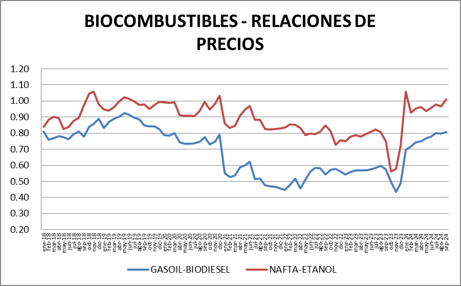 La relación de valores en nafta – etanol (1,01) subió respecto al mes anterior.