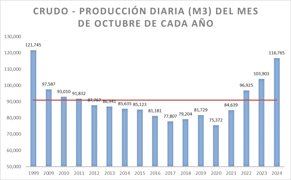 La producción diaria de octubre de 2024 es superior al promedio de la serie (que incluye el valor de 1999 y es 91.010 m3/día).