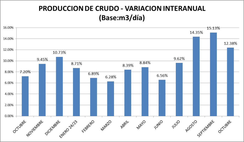 Acumulado a octubre, la producción de petróleo crudo viene subiendo un 9,73%.
