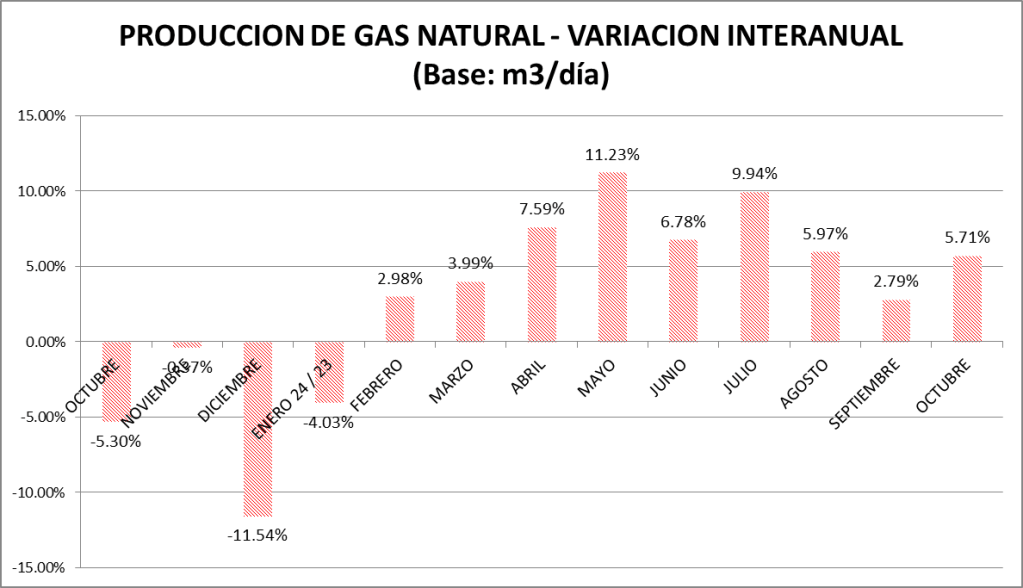 Agregaremos, también para el gas natural, cuadro y gráfico de la variación entre 2024 y 2023 (Mm3/día):