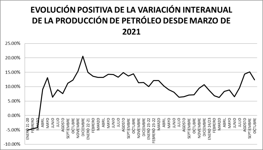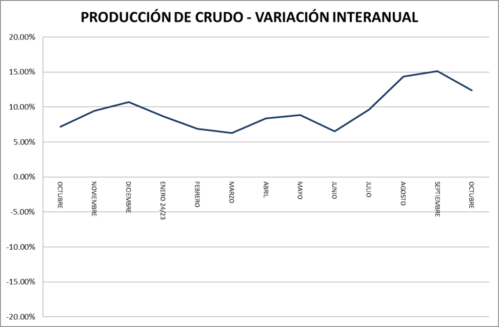 En el mes de octubre de 2024, en petróleo crudo, se muestra un crecimiento interanual por debajo de la evolución promedio.