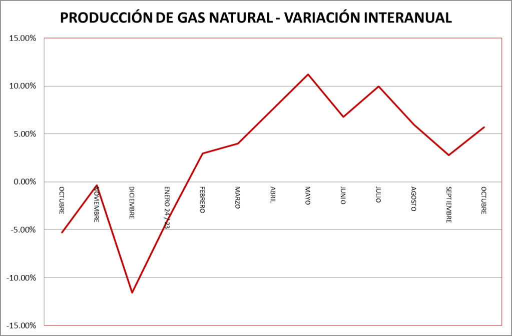 La producción de gas natural de los meses de octubre de cada año puede verse en el gráfico a continuación: