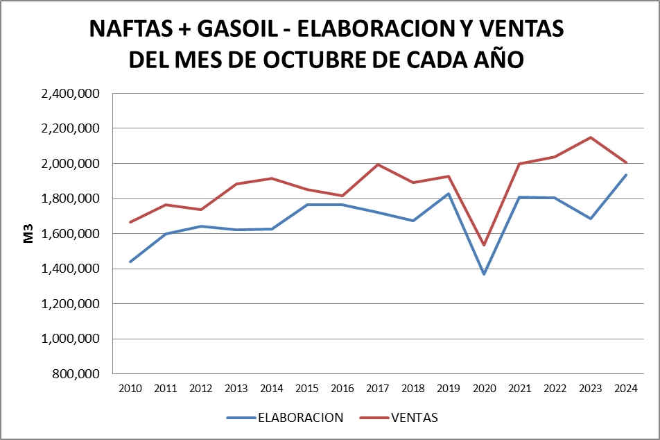 Históricamente las ventas superan a la elaboración y ese déficit es cubierto por importaciones. En octubre de 2024 las ventas y la elaboración se acercan en forma importante.