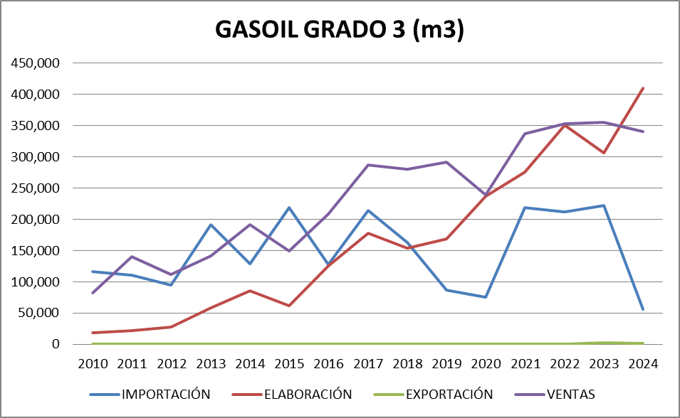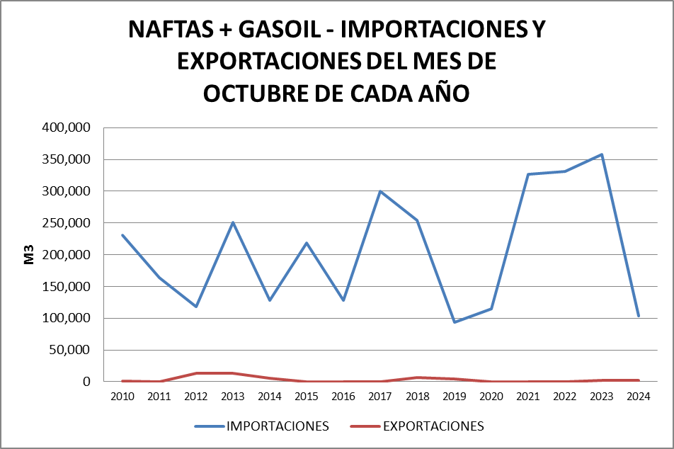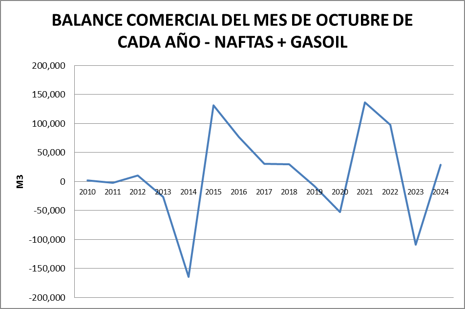 En octubre de 2024 sigue el negativo de gasoil grado 2 aunque se verificó una compensación con el balance de gasoil grado 3. No se registran faltantes de productos en el mercado.