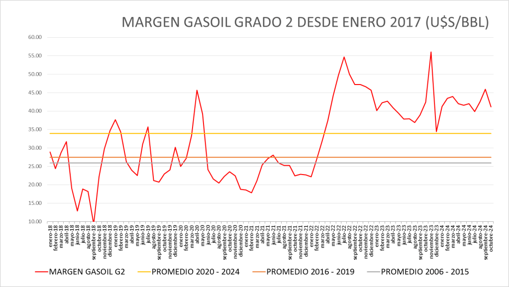 El Margen del gasoil grado 2 de octubre de 2024 (41,16 u$s/bbl) se sitúa por encima del promedio del período enero de 2016 a octubre de 2024 (32,56 u$s/bbl).