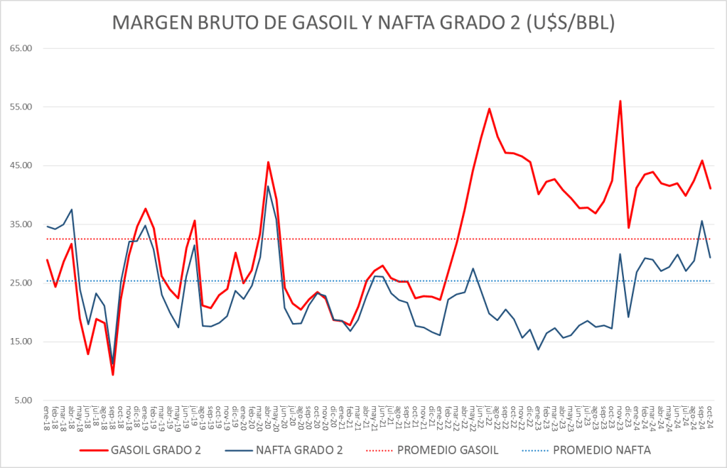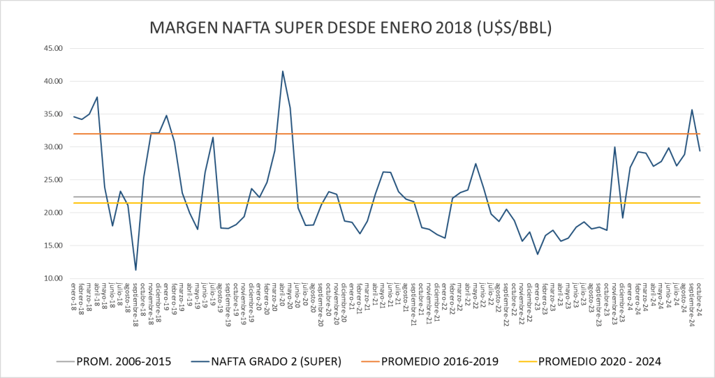 El margen bruto de nafta está por debajo, en octubre de 2024, del promedio 2016-2019.