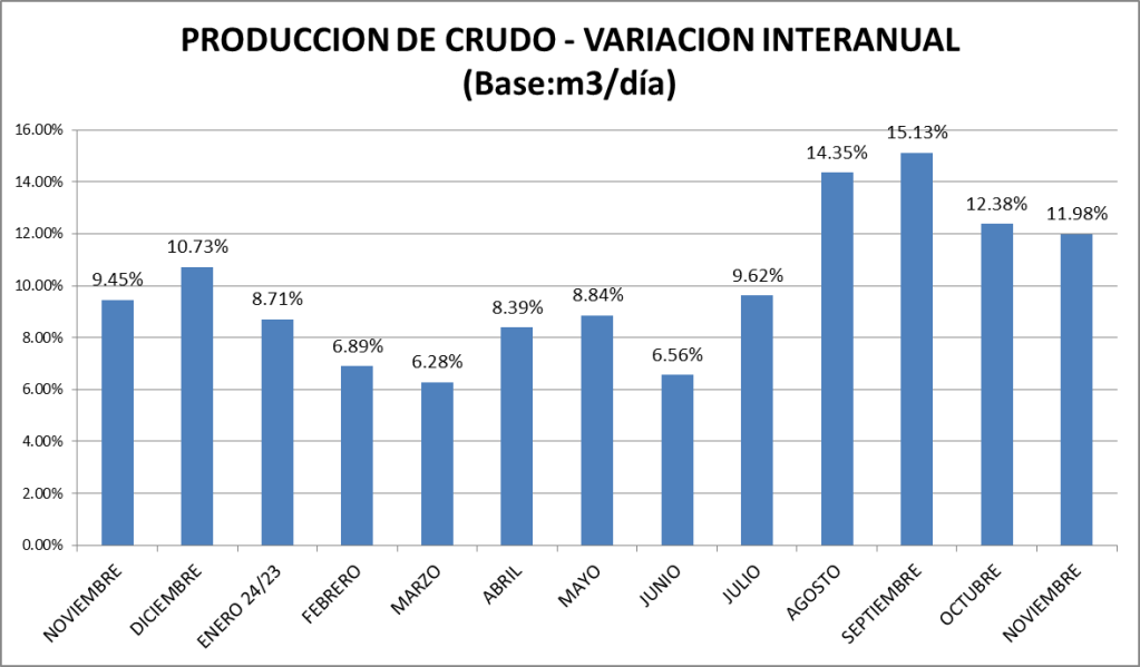 Acumulado a noviembre, la producción de petróleo crudo viene subiendo un 9,95%.