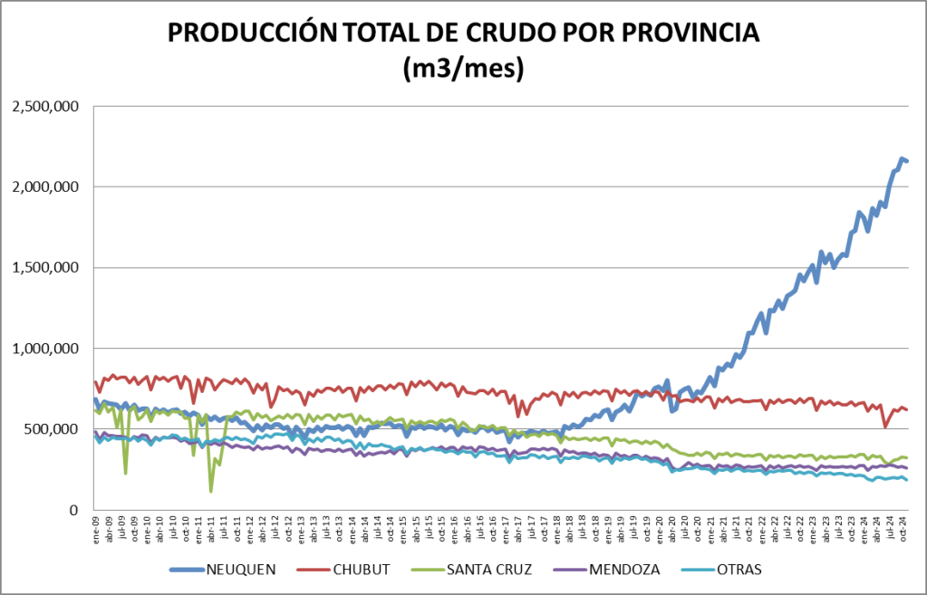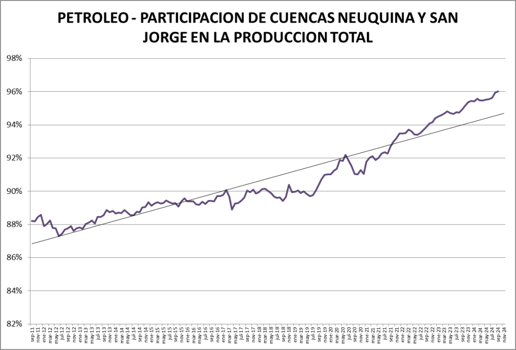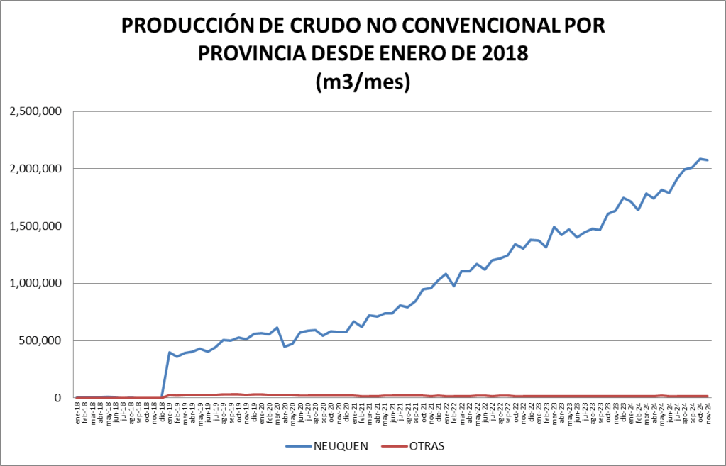 La participación del crudo no convencional en el total de la producción nacional fue, en noviembre de 2024, del 58,75%, que se constituye en un nuevo record.