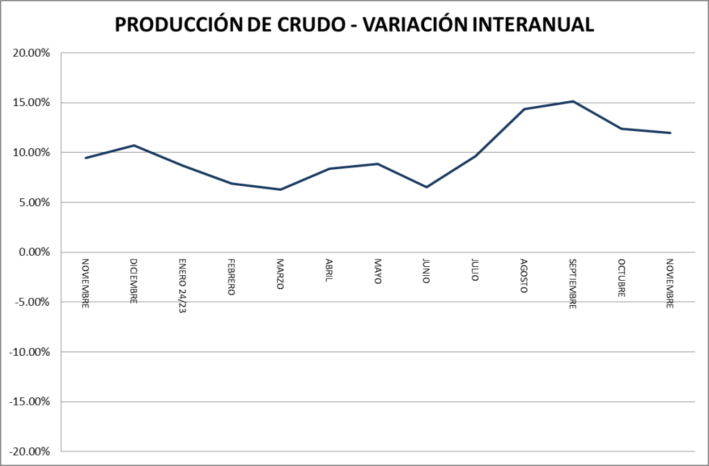 Vamos a seguir la evolución de las variaciones interanuales para hacer un diagnóstico mensual. En el mes de noviembre de 2024, en petróleo crudo, se muestra un crecimiento interanual similar al de la evolución promedio