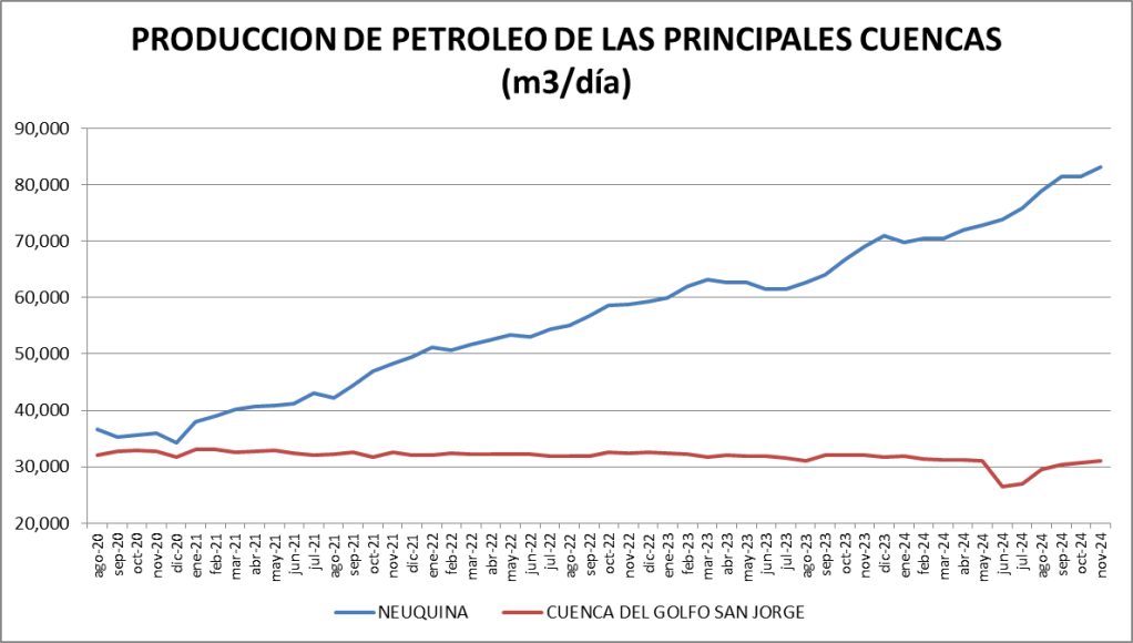 La Cuenca Neuquina es la que más sigue creciendo interanualmente, apoyando su producción en Vaca Muerta (+20,38%, interanual). La segunda cuenca en importancia, la del Golfo San Jorge bajó un 3,00%.