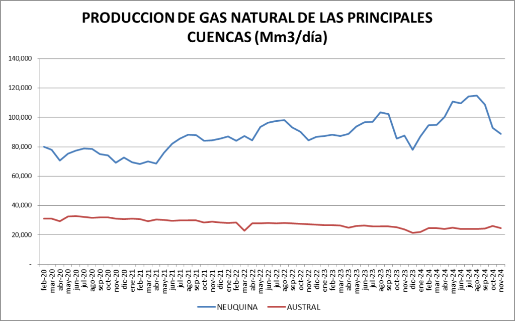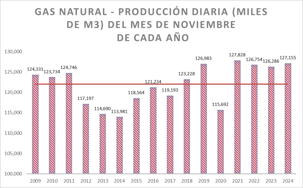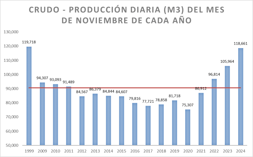 La producción diaria de noviembre de 2024 es superior al promedio de la serie (que incluye el valor de 1999 y es 90.634 m3/día).