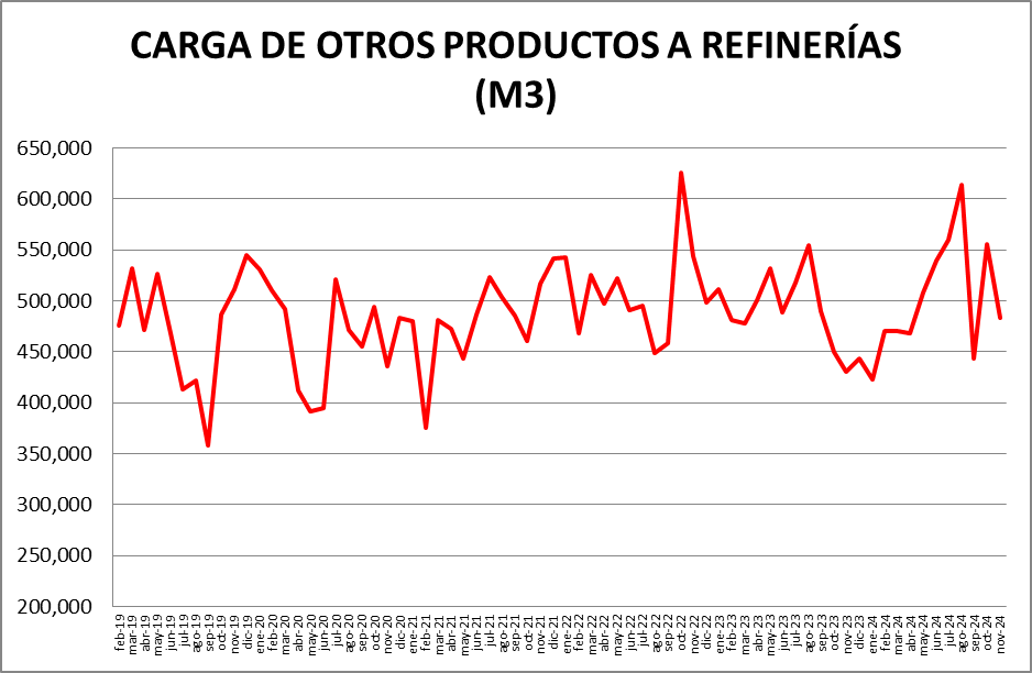 Dentro del rubro “Otras cargas” donde ” se encuentran: naftas sin terminar, mejoradores octánicos, cortes de gasoil, nafta virgen, cortes de kerosene, nafta reformada, destilado de vacío, etc., la evolución fue la siguiente: respecto a octubre de 2024: -13,04%; respecto a noviembre de 2023: +12,36%.