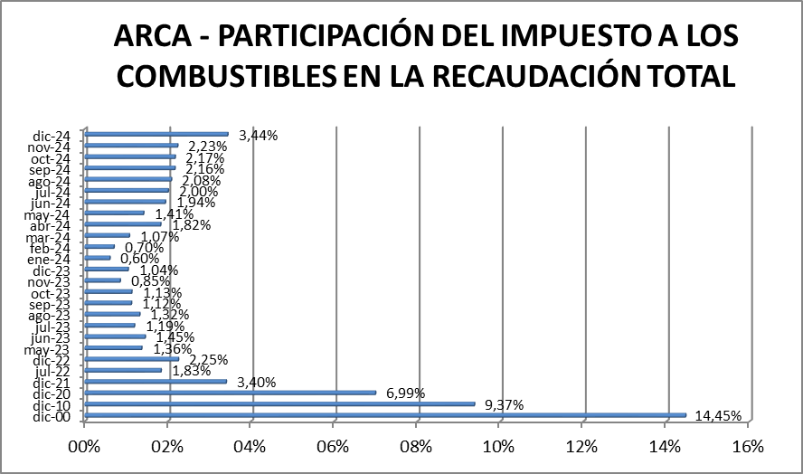 En el mismo lapso, la recaudación total de recursos tributarios creció un 120% y la participación (o peso) de los combustibles en el total recaudado pasó de 1,04% en diciembre de 2023 a 3,44% un año después.