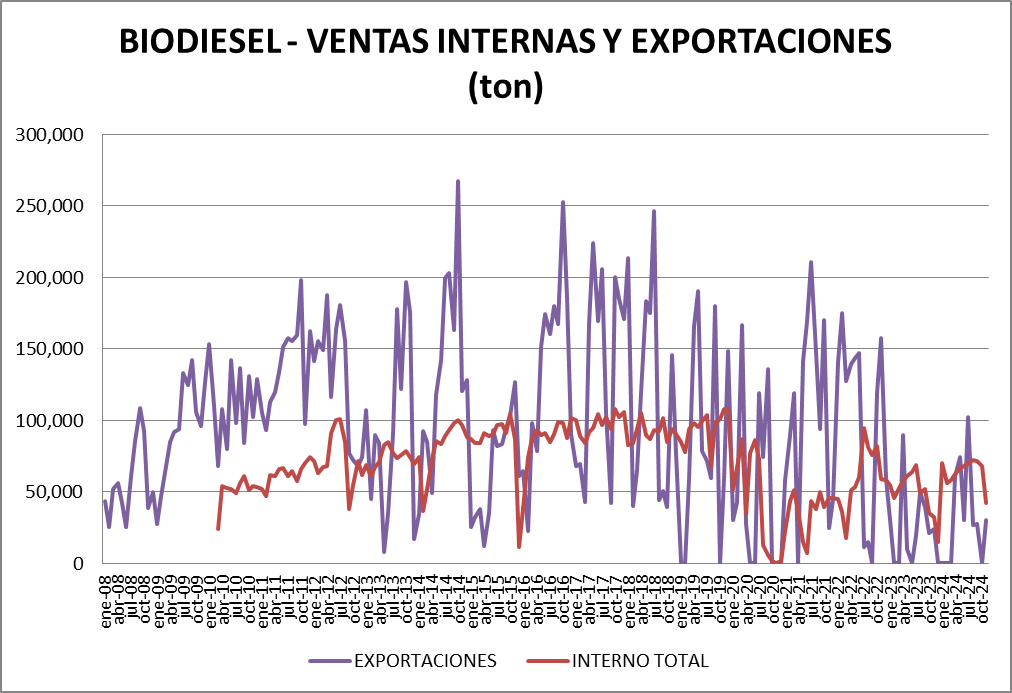 Para el biodiesel, la información parte desde enero de 2008 para las exportaciones y desde febrero de 2010 para la venta a refinerías.