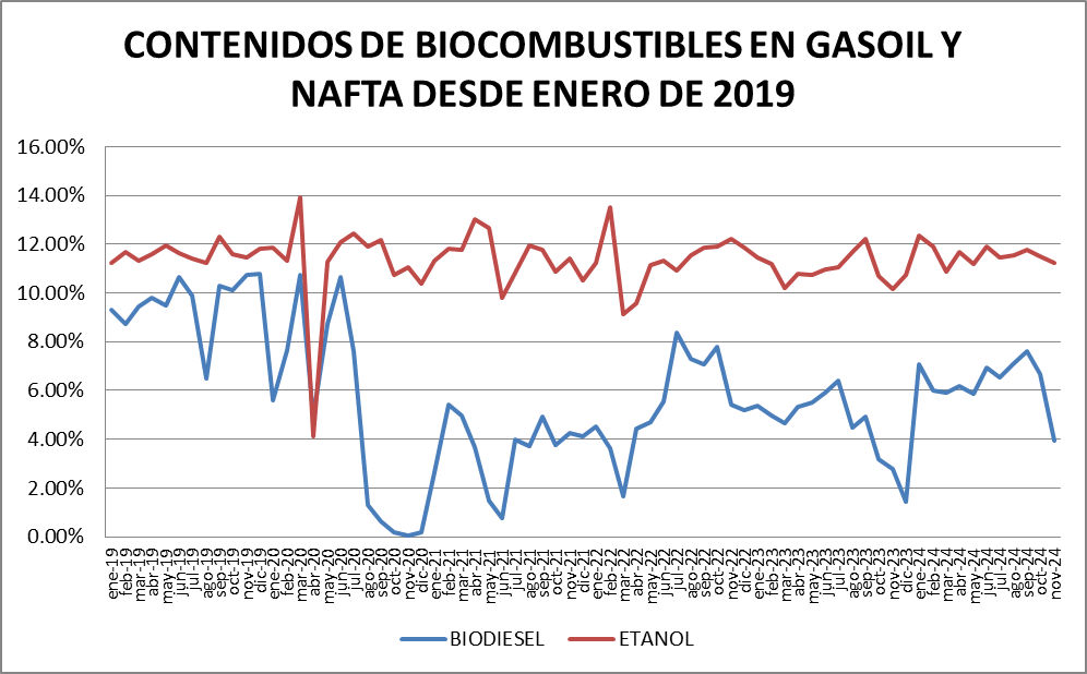 El contenido de biodiesel en gasoil fue, en noviembre de 2024, de 3,93%. Una caída abrupta.