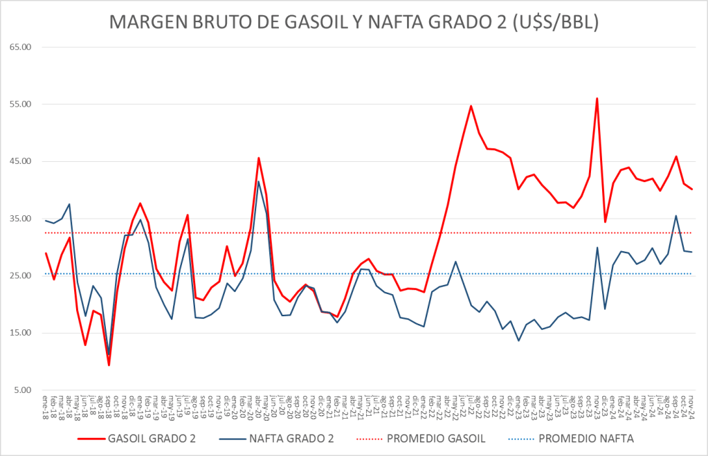 El margen bruto de la nafta está por debajo, en noviembre de 2024, del promedio 2016-2019.