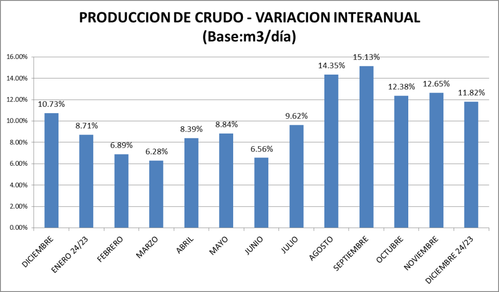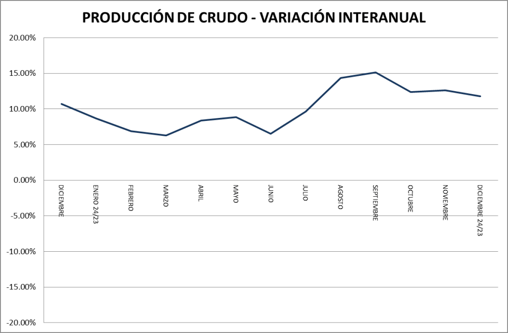 En el mes de diciembre de 2024, en petróleo crudo, se muestra un crecimiento interanual similar al de la evolución promedio.