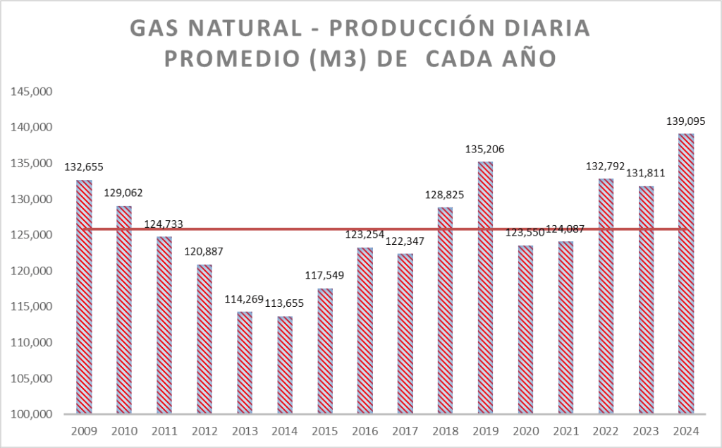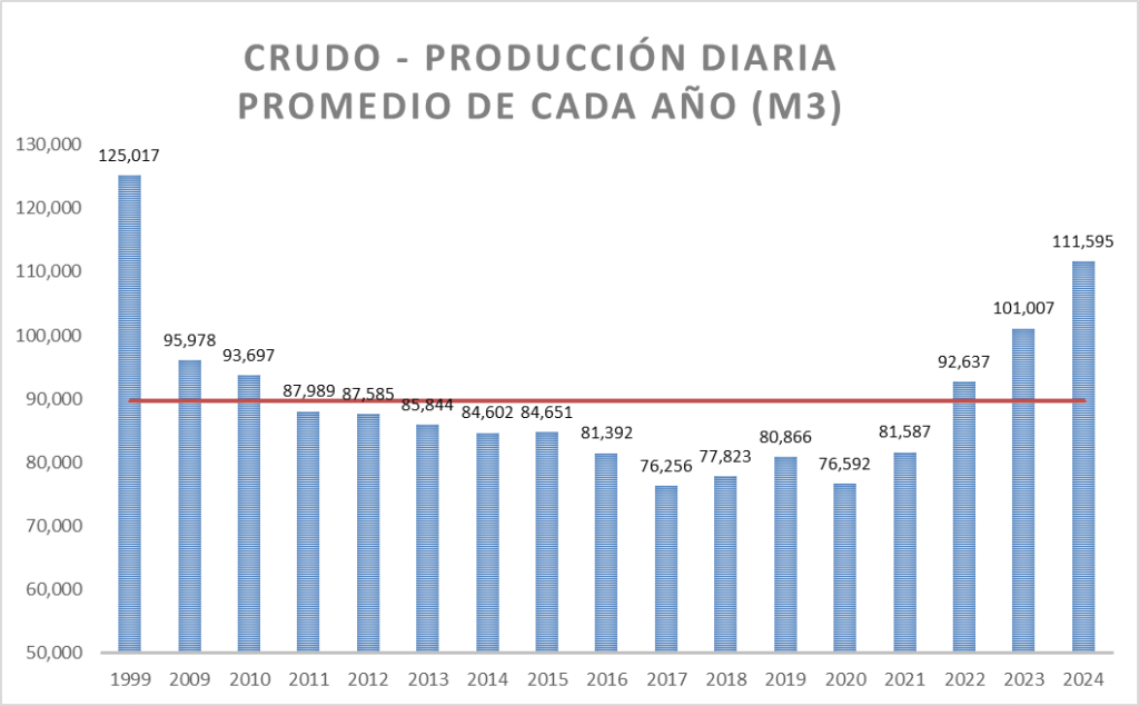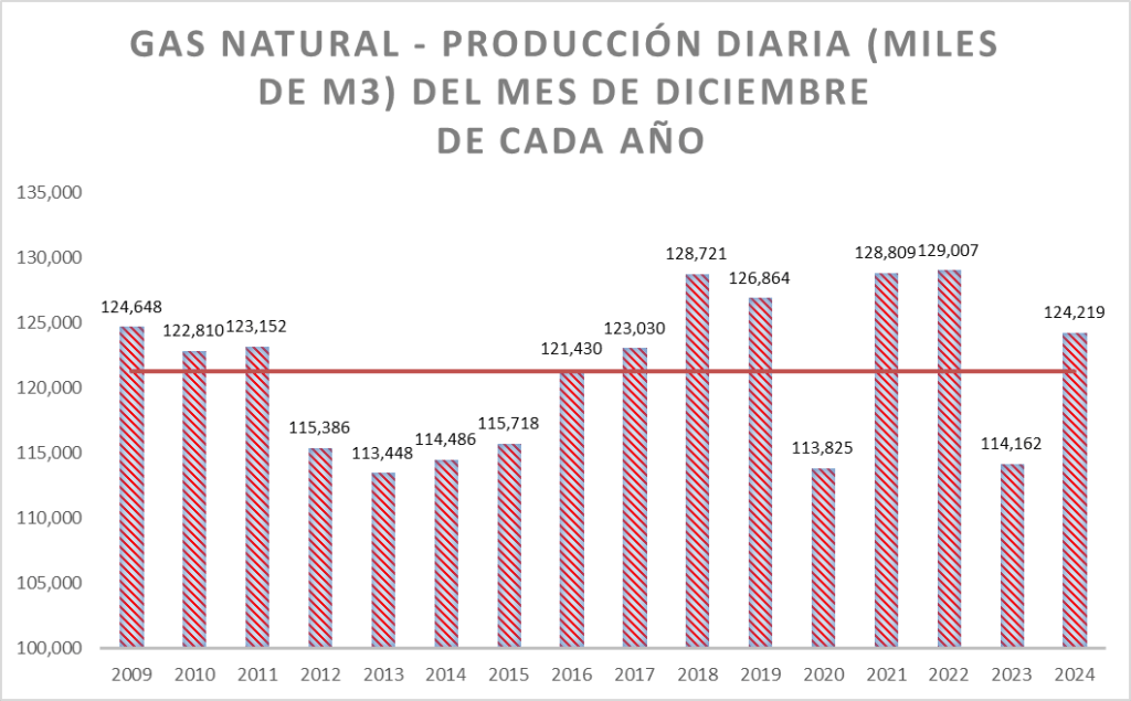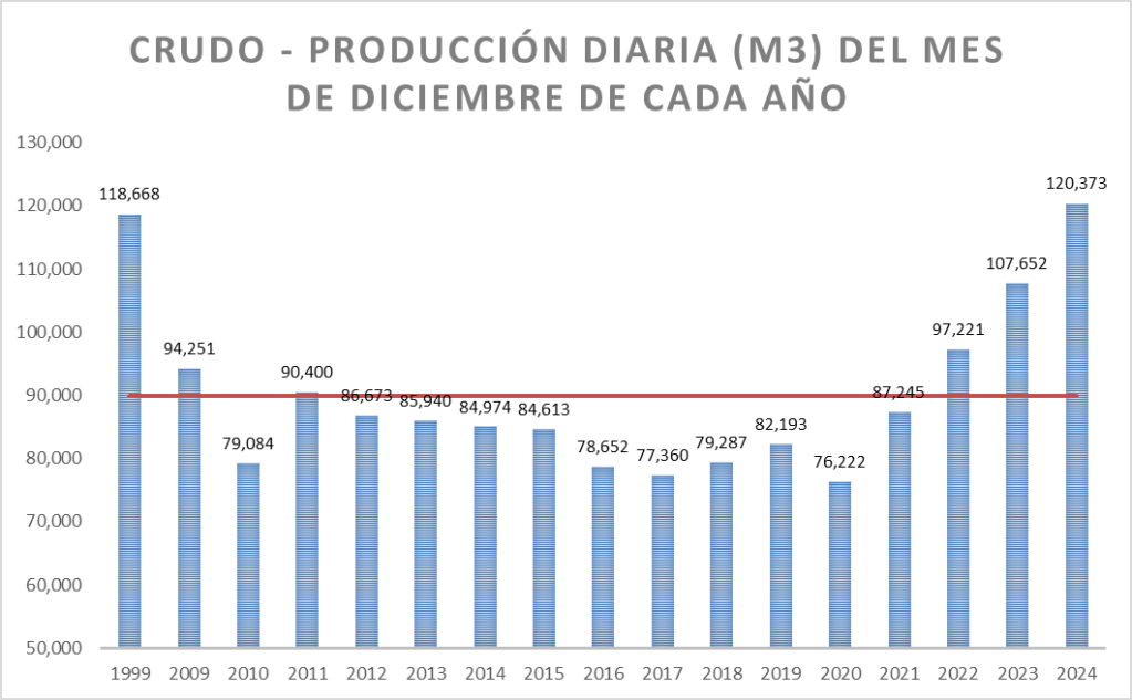 La producción diaria de diciembre de 2024 es superior al promedio de la serie (que incluye el valor de 1999 y es 90.047 m3/día).