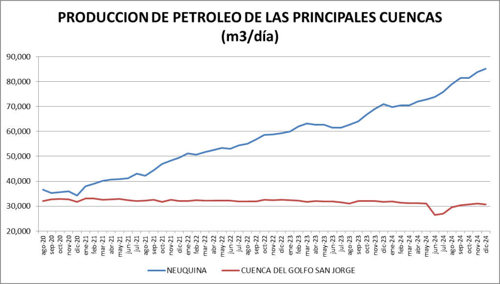 La Cuenca Neuquina es la que más sigue creciendo interanualmente, apoyando su producción en Vaca Muerta (+19,93%, interanual). La segunda cuenca en importancia, la del Golfo San Jorge bajó un 3,15%.