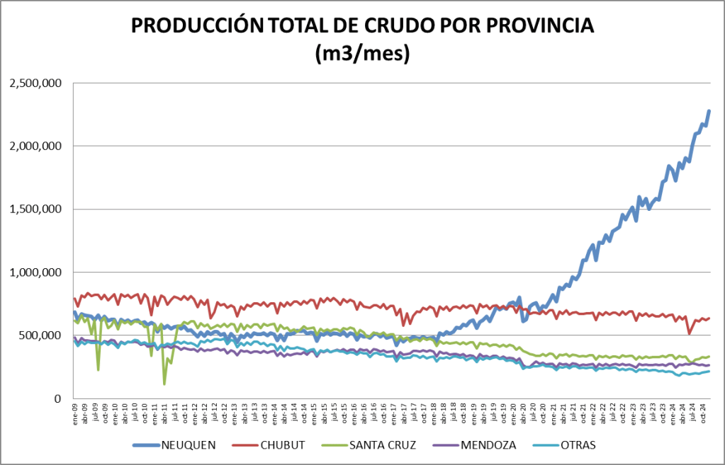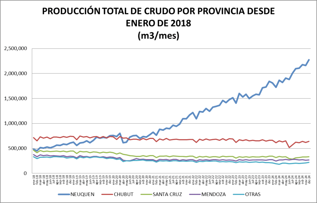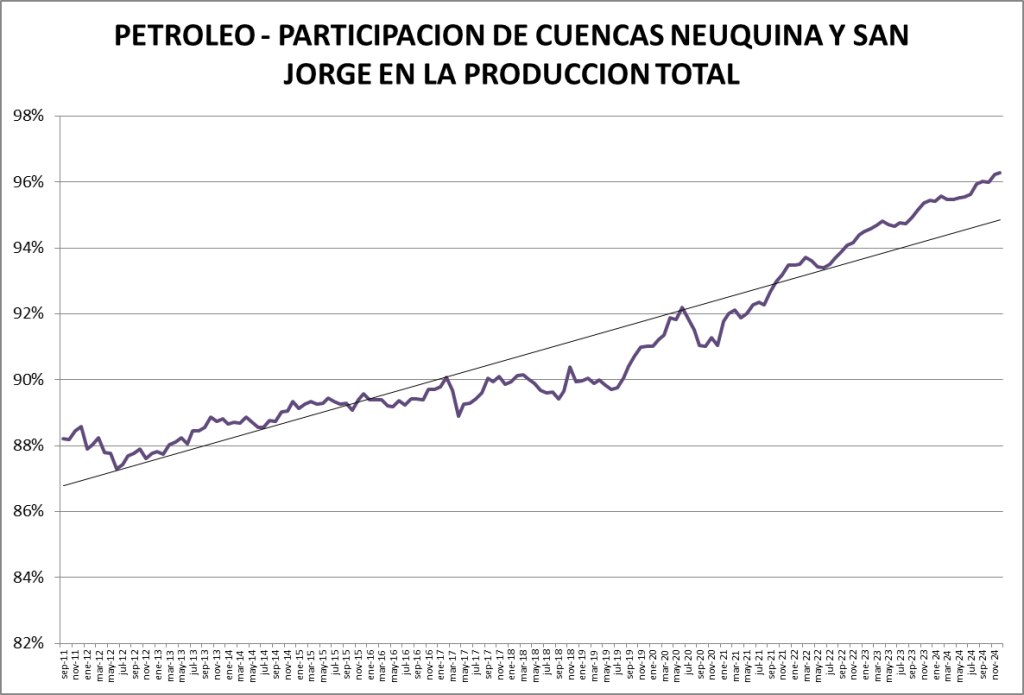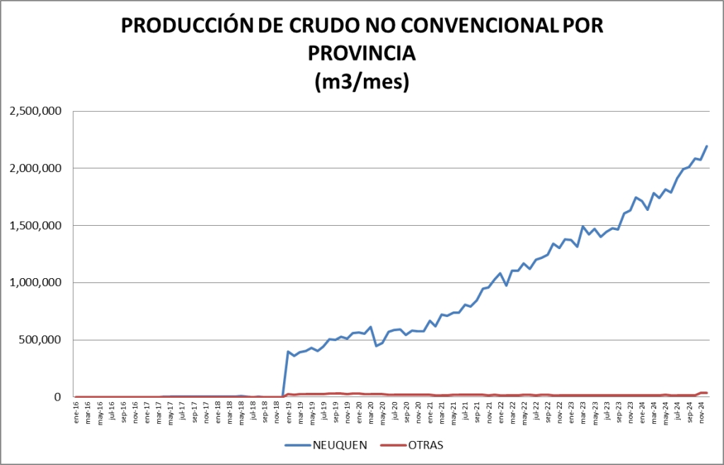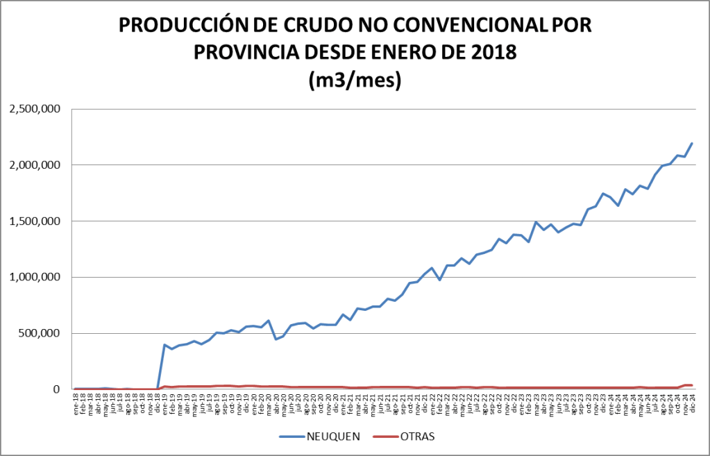 La participación del crudo no convencional en el total de la producción nacional fue, en diciembre de 2024, del 58,96%, que se constituye en un nuevo record.