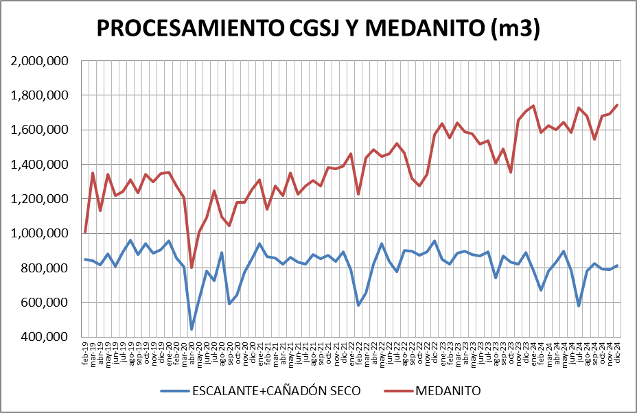 Escalante-Cañadón Seco: Se procesó, en diciembre de 2024, un 3,5% más que en noviembre de 2024 y un 8,41% menos que en diciembre de 2023.