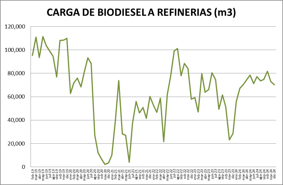 La carga de biodiesel en refinerías bajó, en diciembre de 2024, un 3,86% respecto al mes anterior.