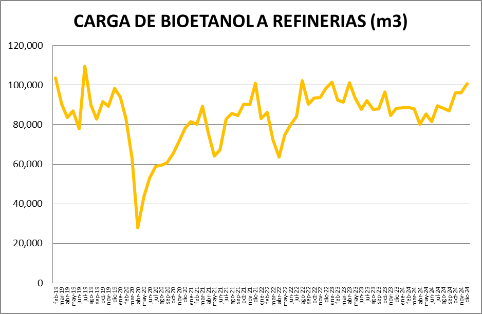 En cuanto al bioetanol, se utilizó en diciembre de 2024, un 4,71% más que en noviembre de 2024.