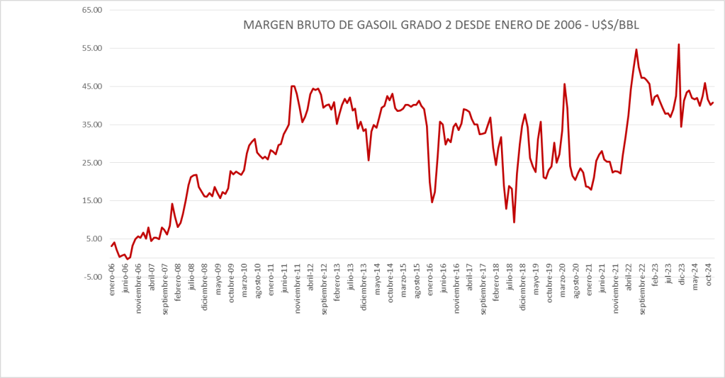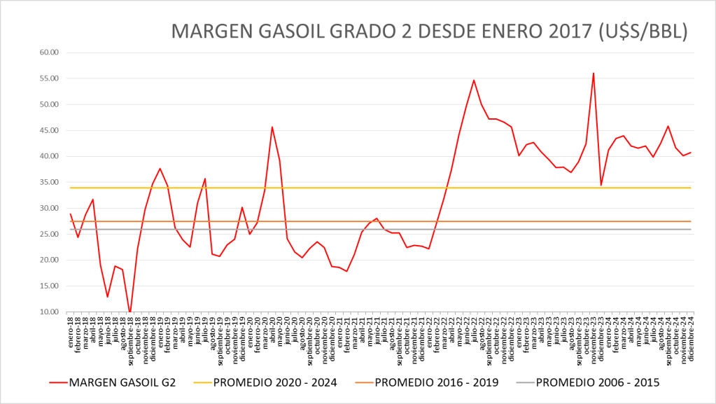 El Margen del gasoil grado 2 de diciembre de 2024 (40,73 u$s/bbl) se sitúa por encima del promedio del período enero de 2016 a diciembre de 2024 (32,74 u$s/bbl).