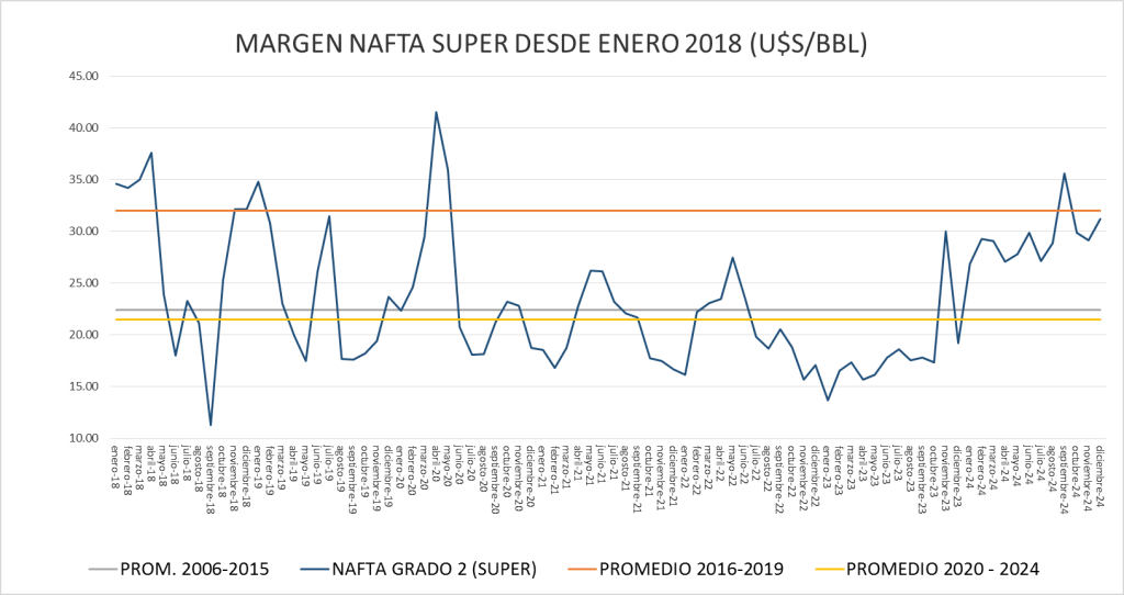 El margen bruto de nafta está por debajo, en diciembre de 2024, del promedio 2016-2019.